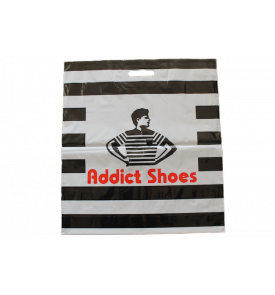 Sac en plastique personnalisé de grande contenance à poignées découpées simples et soufflet de fond. Disponible dans une large gamme d'épaisseur, de matières (PEBD/PEMD/PEHD), de taille et de couleurs. Sac idéal pour boutiques et salons.