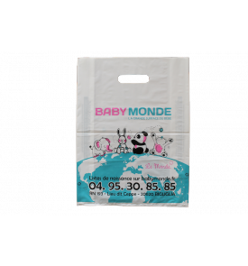 Sac en plastique personnalisé de grande contenance à poignées découpées simples et soufflets latéraux. Disponible dans une large gamme d'épaisseur, de matières, de tailles et de couleurs. Sac idéal pour boutiques.
