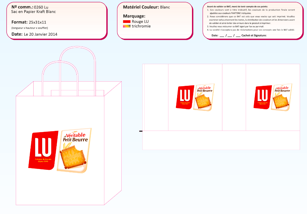 LU est une marque française de biscuits emblématique de la ville de Nantes. A l’occasion du salon de l’agriculture 2014, nous avons réalisé pour le stand LU, des sacs en papier couché personnalisé avec le produit phare de la marque, le Petit beurre. Des sacs à croquer..
