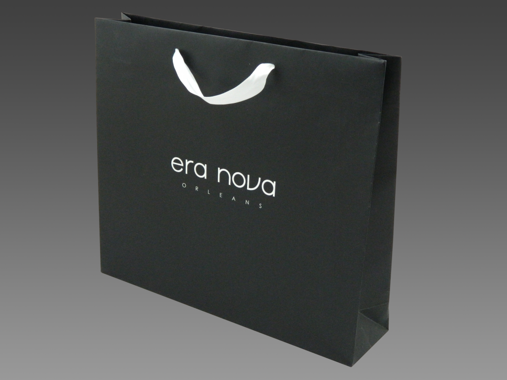 Nul doute que les clients repartiront avec plaisir avec les sacs papier luxes personnalisés commandés à monsacpublicitaire.com, des sacs en papier couché imprimés en noir et blanc avec pelliculage mat et poignées en ruban satin. Un contenant chic pour un contenu chic !