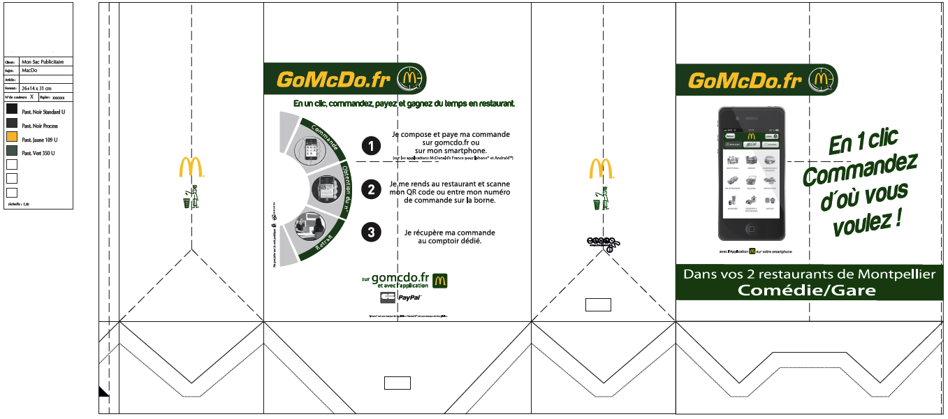 Pour cette enseigne, nous avons réalisé, fin 2012, des sacs pour une de ces opérations de street marketing (marketing de rue), reconnues pour leur créativité et leur originalité. Objectif de cette campagne GoMcDo.fr menée à Montpellier : inciter les clients à utiliser une application Smartphone pour commander, payer et récupérer leur repas.