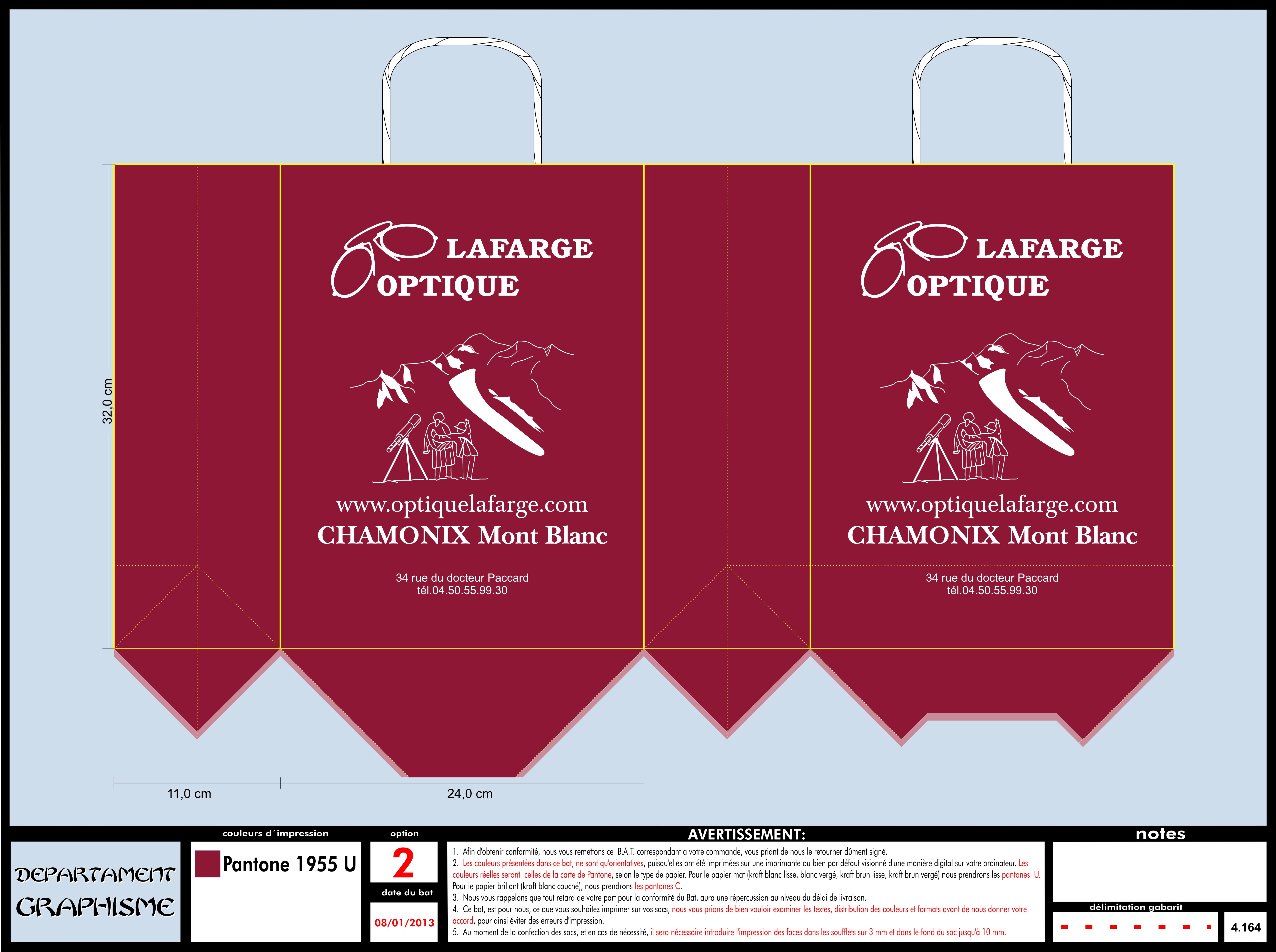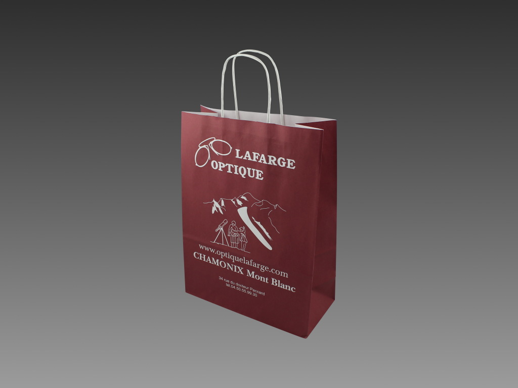 Pour cette enseigne, nous avons créé des sacs en papier kraft imprimés en 1 couleur. Une impression 100% sur toute la surface des sacs. Des sacs signés monsacpublicitaire.com pour des lunettes siglés Optique Lafarge !