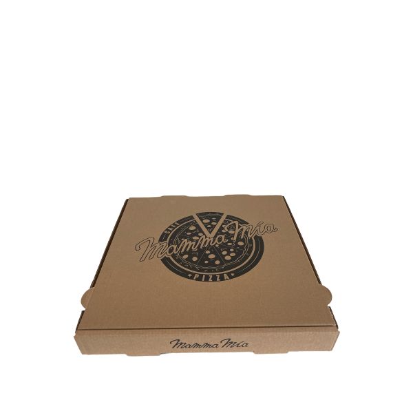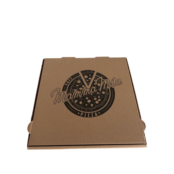Boite à pizza personnalisée à coins droits en carton microcannelé kraft blanc ou brun recyclable résistant au gras et agrée contact alimentaire direct, équipée d'un système d'aération pour éviter que la pizza ne ramolisse.