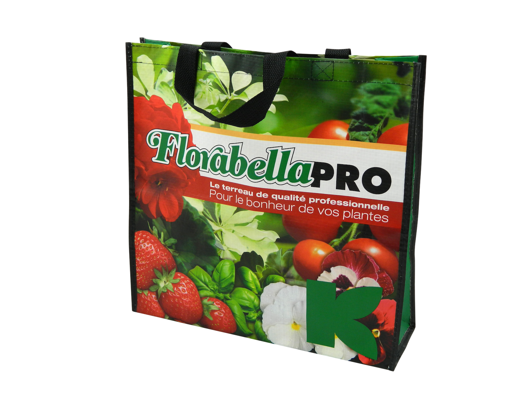 - Sac en polypropylène non tissé (aspect toile) ou sac en polypropylène tissé (sac cabas supermarché) avec impression 1 couleur à partir de 250 exemplaires.