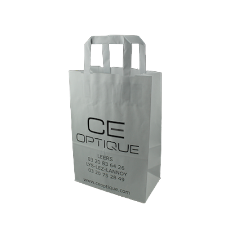 Sac publicitaire en papier, finition automatique, poignées plates en papier collées à l’intérieur du sac, patch de renfort collé à l'intérieur. Quantité min: 5 000 ex. Impression 1 à 6 couleurs.
