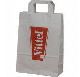 Sac publicitaire en papier, finition automatique, poignées plates en papier collées à l’intérieur du sac, patch de renfort collé à l'intérieur.