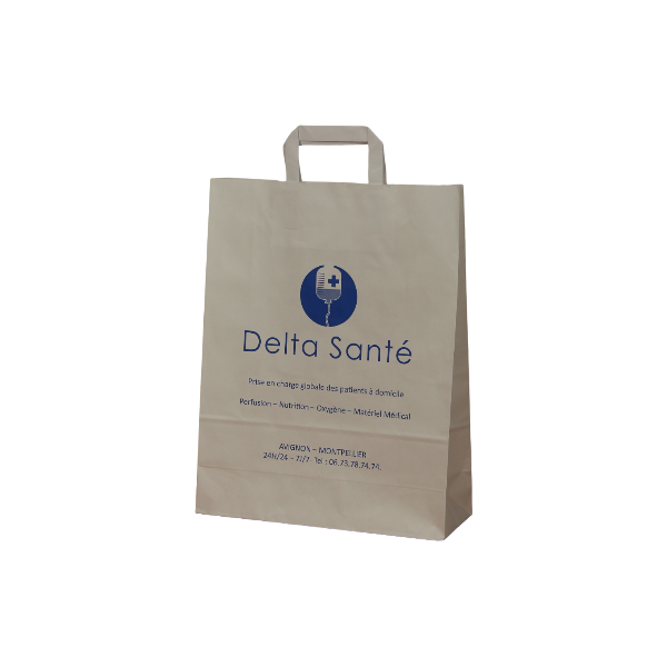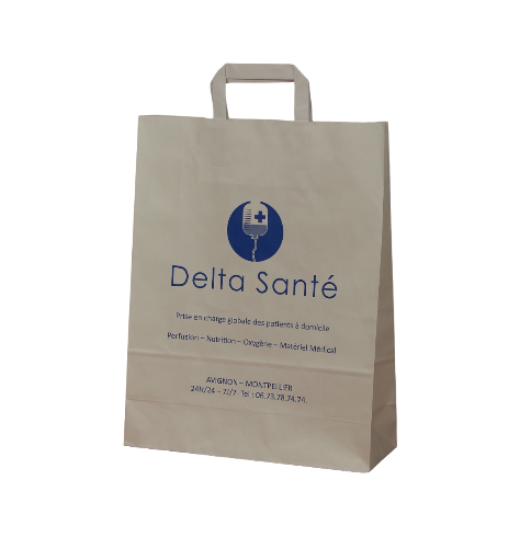 Sac publicitaire en papier, finition automatique, poignées plates en papier collées à l’intérieur du sac, patch de renfort collé à l'intérieur.