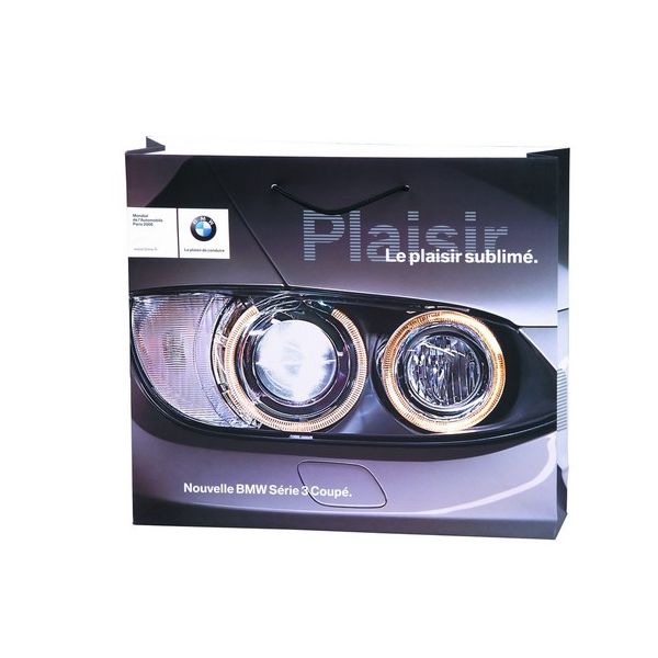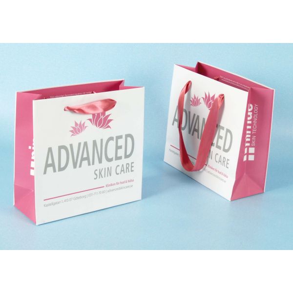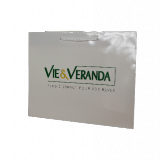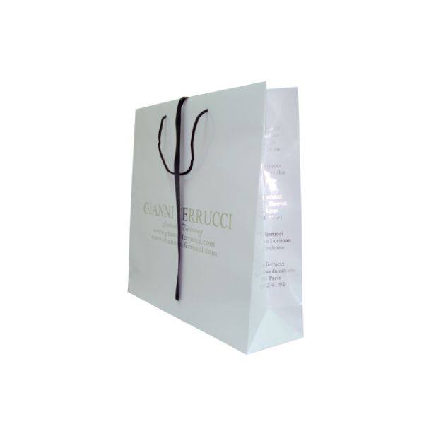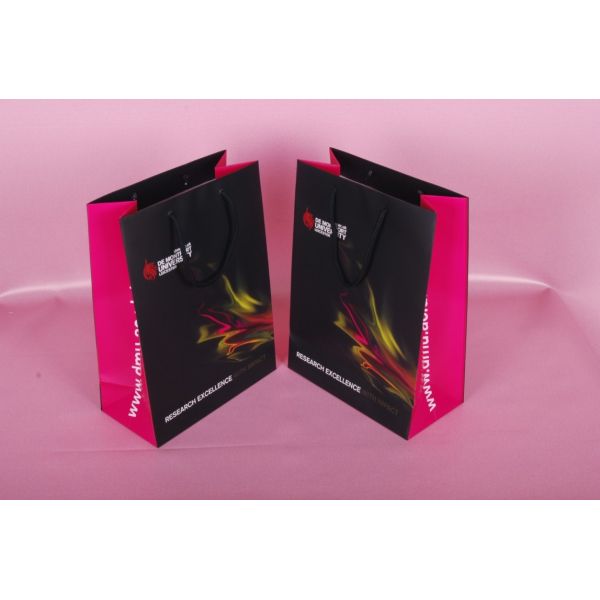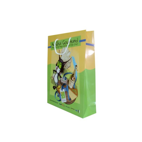 Sac publicitaire en papier réalisé manuellement avec fond cartonné et revers, nombreux choix de finitions, de poignées et de papier haut de gamme. Impression en 6 couleurs.