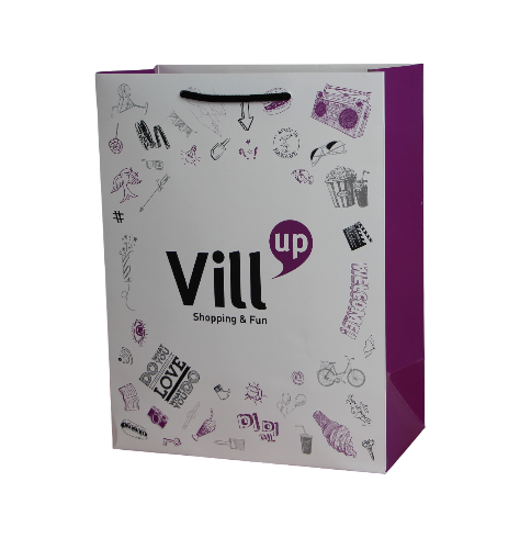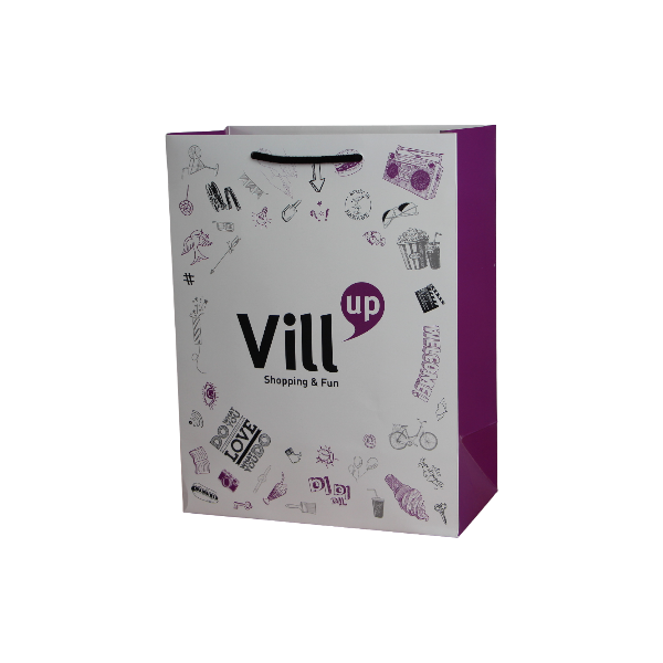 Sac publicitaire en papier réalisé manuellement avec fond cartonné et revers, nombreux choix de finitions, de poignées et de papier haut de gamme. Impression 1 à 6 couleurs.