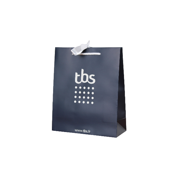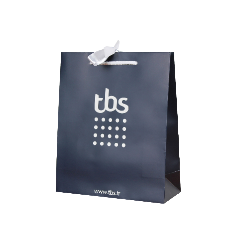 Sac publicitaire en papier réalisé manuellement avec fond cartonné et revers, nombreux choix de finitions, de poignées et de papier haut de gamme. Impression 1 à 6 couleurs.