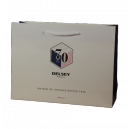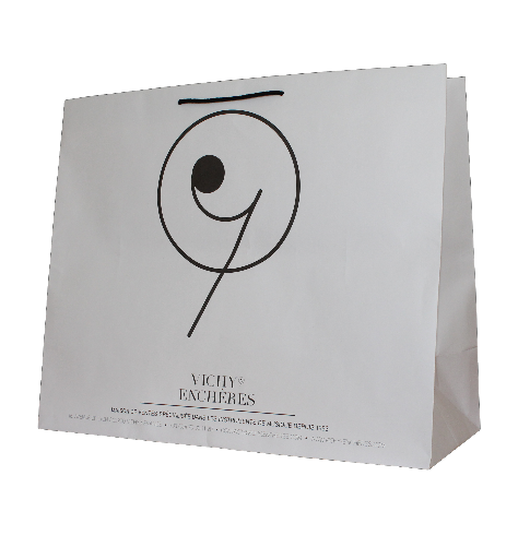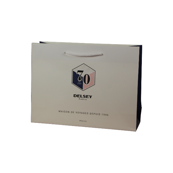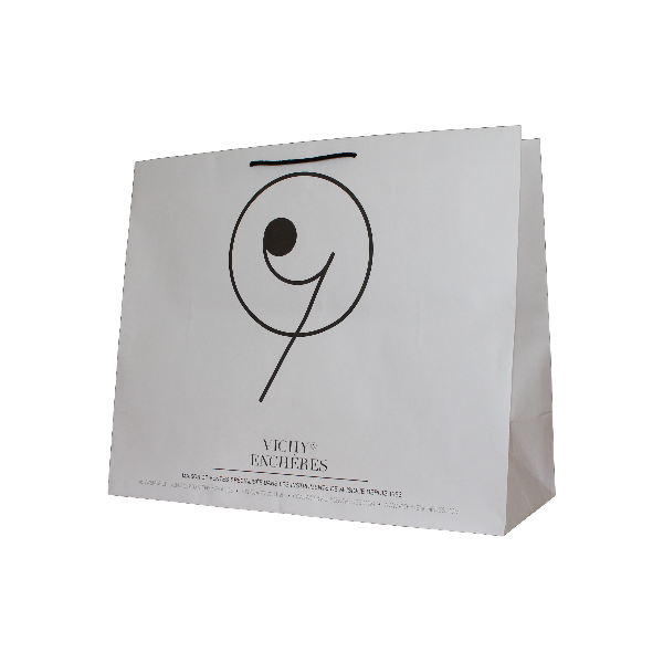 Sac publicitaire en papier réalisé manuellement avec fond cartonné et revers, nombreux choix de finitions, de poignées et de papier haut de gamme. Impression en 6 couleurs.