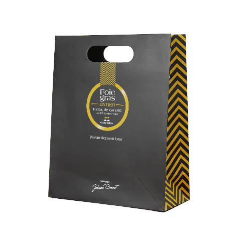 Sac publicitaire en papier luxe, finition manuelle, avec poignées découpées renforcées.
