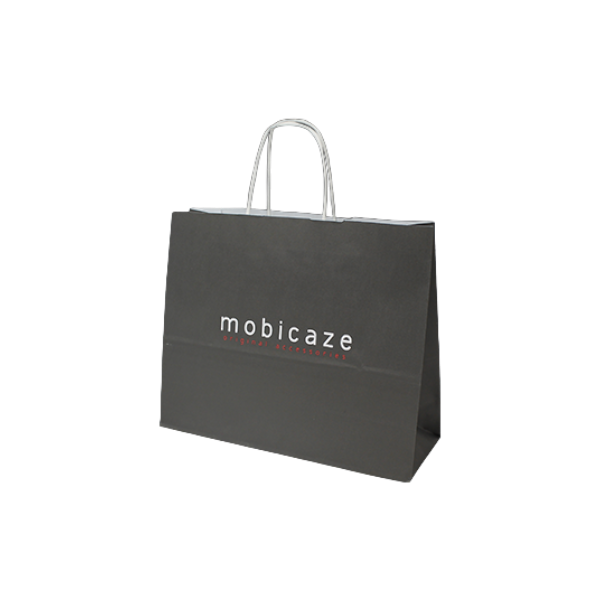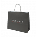 Sac publicitaire en papier en finition automatique, poignées torsadées en papier ou coton, patch de renfort de papier contrecollé à l'intérieur. Quantité min. 3 000 ex. Impression 1 à 6 couleurs. Dim.: 41(L) + 12(S) x 36(H). Idéal pour tout type commerce.