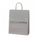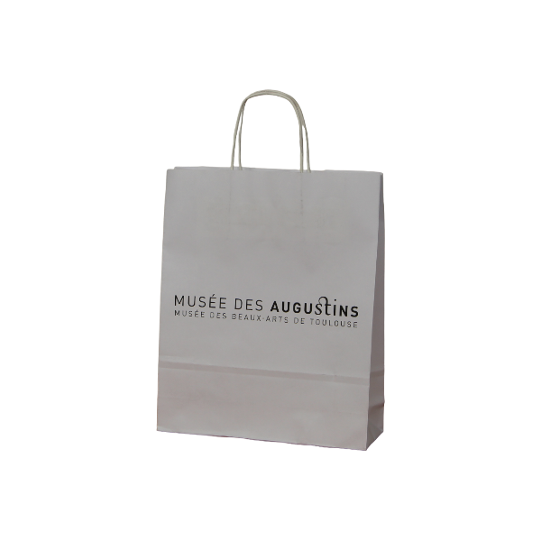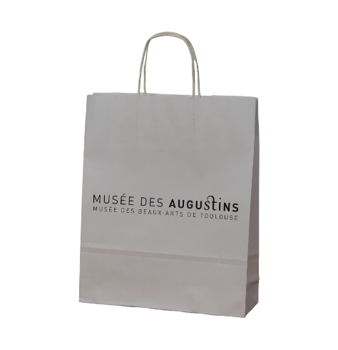 Sac publicitaire en papier en finition automatique, poignées torsadées en papier ou coton, patch de renfort de papier contrecollé à l'intérieur. Quantité min. 3 000 ex. Impression 1 à 6 couleurs. Dim.: 28(L) + 12(S) x 36(H). Idéal pour tout type commerce.