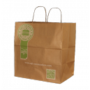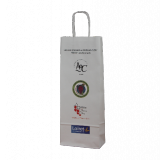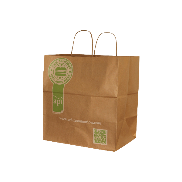 Sac publicitaire en papier, finition automatique, poignées torsadées en papier ou en coton, patch de renfort de papier contrecollé à l'intérieur.