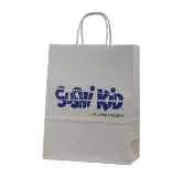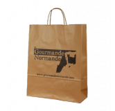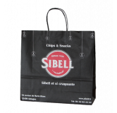 Sac publicitaire en papier en finition automatique, poignées torsadées en papier ou coton, patch de renfort de papier contrecollé à l'intérieur. Quantité min. 3 000 ex. Impression 1 à 4 couleurs. Dim.: 25(L) + 11(S) x 46(H). Idéal pour tout type commerce.