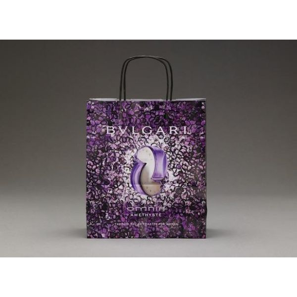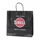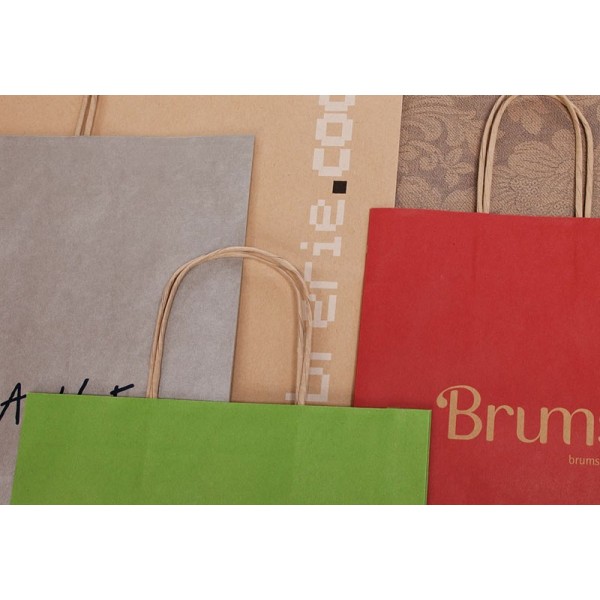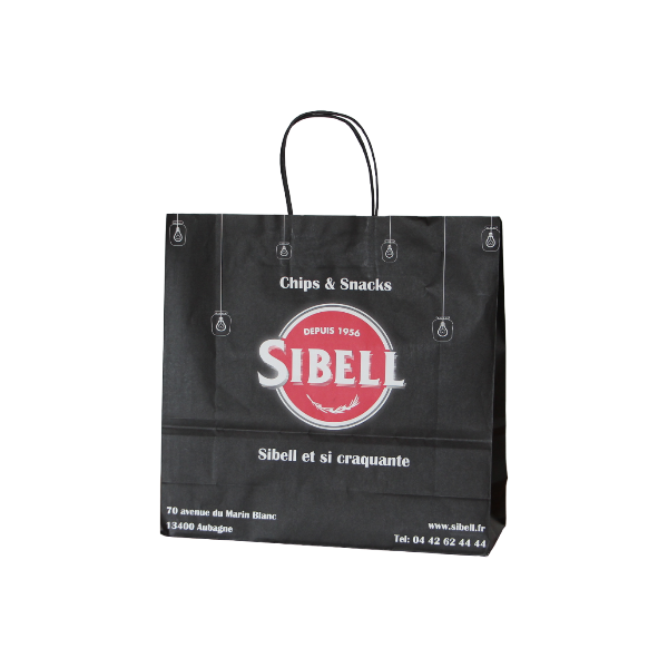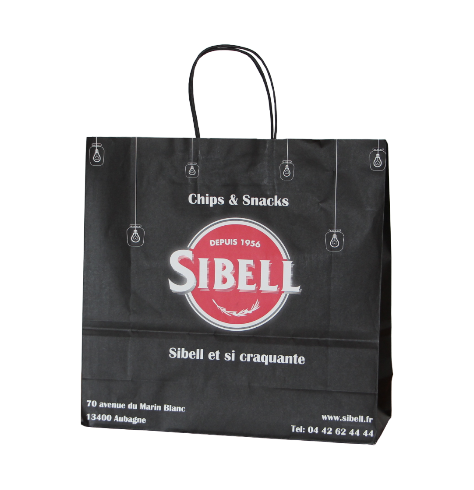 Sac publicitaire en papier en finition automatique, poignées torsadées en papier ou coton, patch de renfort de papier contrecollé à l'intérieur. Quantité min. 3 000 ex. Impression 1 à 6 couleurs. Dim.: 36(L) + 12(S) x 36(H). Idéal pour tout type commerce.