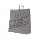 Sac publicitaire en papier en finition automatique, poignées torsadées en papier ou coton, patch de renfort de papier contrecollé à l'intérieur. Quantité min. 3 000 ex. Impression 1 à 6 couleurs. Dim.: 35(L) + 18(S) x 34(H). Idéal pour tout type commerce.