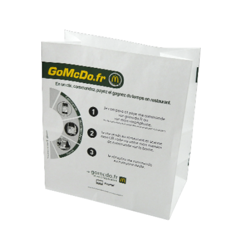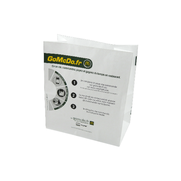 Sac publicitaire en papier kraft une ou deux couches, finition automatique, sans poignées ou SOS. Format idéal pour la restauration rapide et les commerces alimentaires. Disponible à partir de 5 000 exemplaires selon les formats. Impression 1 à 4 couleurs possibles selon quantités. Délai de fabrication et de livraison: 6/7 semaines.