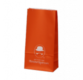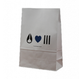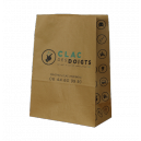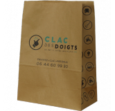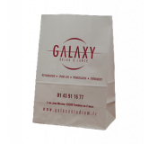 Sac publicitaire en papier kraft une ou deux couches, finition automatique, sans poignées ou SOS. Format idéal pour la restauration rapide et les commerces alimentaires. Disponible à partir de 5 000 exemplaires selon les formats. Impression 1 à 4 couleurs possibles selon quantités. Délai de fabrication et de livraison: 6/7 semaines.