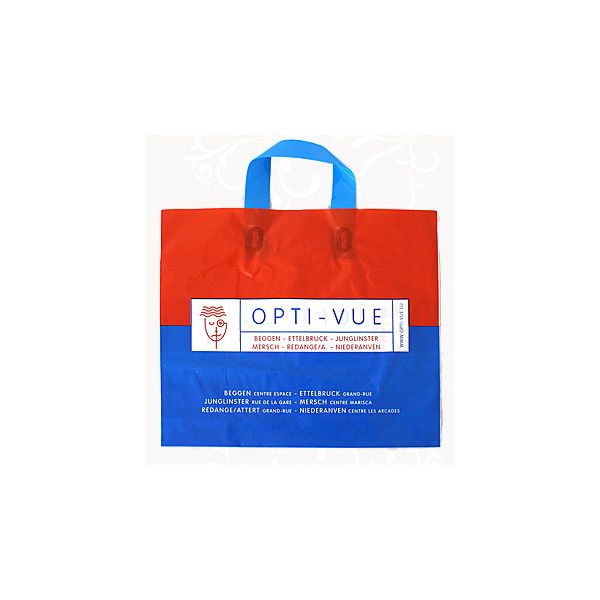 Sac publicitaire en plastique personnalisé à poignées anses souples et soufflet de fond, disponible dans une large gamme d'épaisseur, de matières, de taille et de couleurs. Sac valorisant votre image, idéal pour boutiques. Impression 1 à 8 couleurs selon quantités. Quantité min.:3 000 ex. Délai de fabrication et de livraison: 4 semaines. Dim.: 54(L) x 50 (H) +5+5(S)