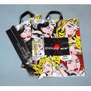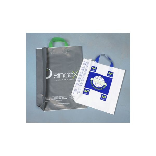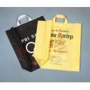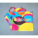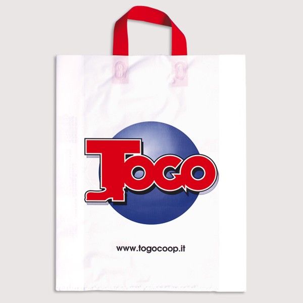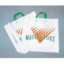 Sac en plastique personnalisé à poignées anses souples et soufflets latéraux. Les soufflets latéraux permettent d'augmenter la contenance du sac et de lui donner une ouverture importante.