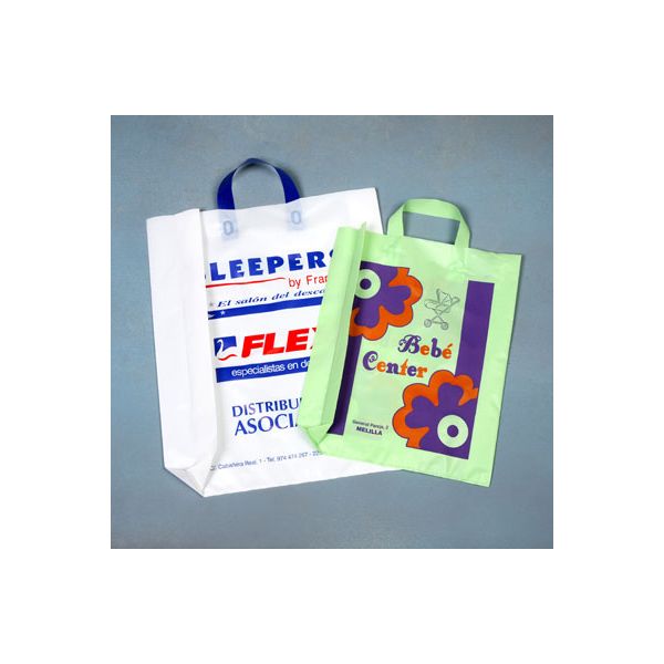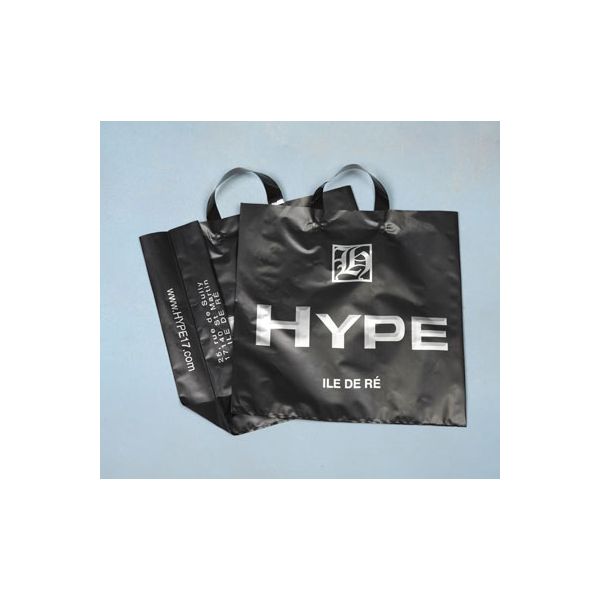 Sac en plastique personnalisé à poignées anses souples et soufflets latéraux. Les soufflets latéraux permettent d'augmenter la contenance du sac et de lui donner une ouverture importante.
