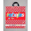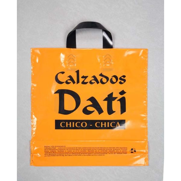 Sac publicitaireen plastique personnalisé à poignées anses souples, disponible dans une large gamme d'épaisseur, de matières, de taille et de couleurs. Sac valorisant votre image, idéal pour boutiques. Impression 1 à 8 couleurs selon quantités. Quantité min.:3 000 ex. Délai de fabrication et de livraison: 4 semaines. Dim.: 45(L) x 50 (H)