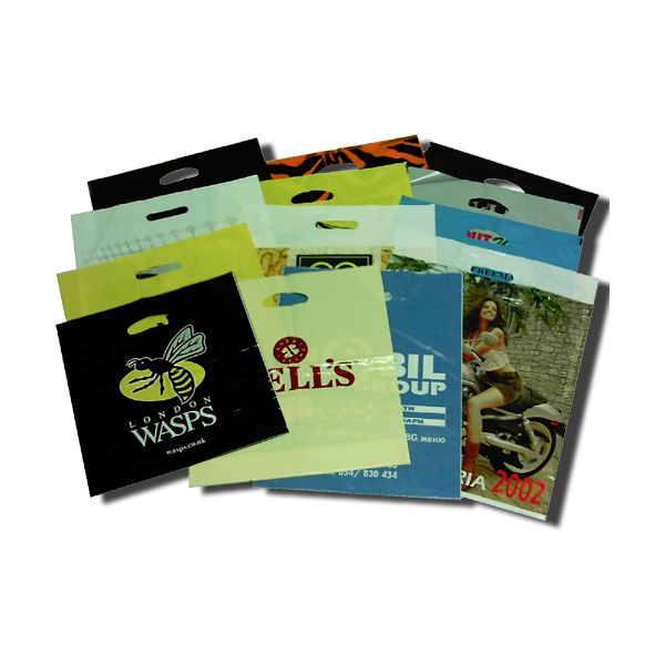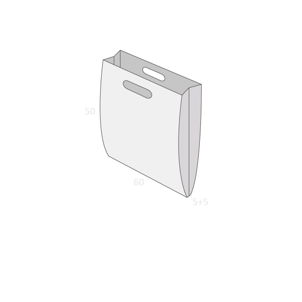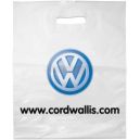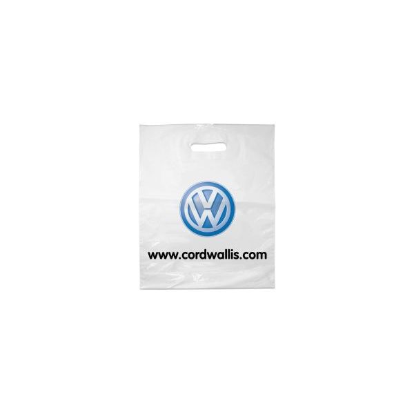 Sac publicitaire en plastique personnalisé de grande contenance à poignées découpées simples et soufflets latéraux. Sac idéal pour boutiques.Impression 1 à 4 couleurs.