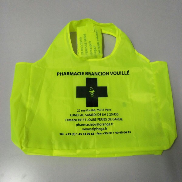 Sac cabas pliable personnalisé en polyester ou sac de course publicitaire très pratique pour faire son shopping. Il présente l'avantage de pouvoir se plier dans une petite pochette, ainsi il est toujours à porter de main! Il est peut être personnalisé jusqu'à 6 couleurs différentes. Ce sac publicitaire convient à tout type d'enseigne (pharmacie, alimentaire,...) ainsi qu'à tout type d'évènement professionnel.