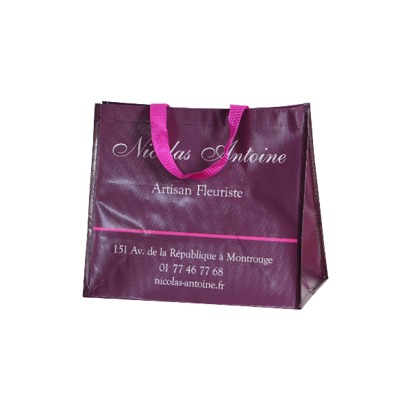 Sac cabas publicitaire réutilisable et recyclable en Polypropylène non tissé (TNT) plastifié. Ce type de sac en matière synthétique est à la fois résistant et facile à nettoyer. Sac cabas principalement destiné aux boutiques, salons et évènements promotionnels. Délai de fabrication: à partir de 3-5 semaines. Quantité min.:500 ex.