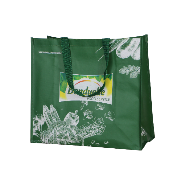 Sac cabas réutilisable et recyclable en Polypropylène non tissé (TNT) avec plastification. Ce modèle de sac en matière synthétique est à la fois résistant et facile à nettoyer. Ce type de sac cabas est réutilisables de nombreuses fois, ce qui en fait un sac particulièrement respectueux de l'environnement. Il a une durée de vie de plusieurs années.
