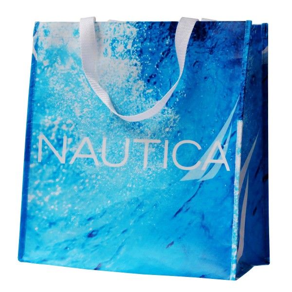 Sac cabas publicitaire réutilisable et recyclable en polyéthylène fabriqué avec 80% de matière recyclée (bouteilles en plastique). Ce type de sac en matière synthétique est à la fois résistant et facile à nettoyer. Sacs cabas principalement destinés aux enseignes écologiques.