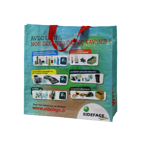 Sac cabas publicitaire réutilisable et recyclable en polypropylène tissé. Ce type de sac en matière synthétique est à la fois résistant et facile à nettoyer. Sac cabas destiné à tout type d'enseigne. Toutes dimensions possibles. Délai de fabrication: à partir de 3 semaines. Quantité min.: 500 ex. (250 ex pour 1 ou 2 couleurs).