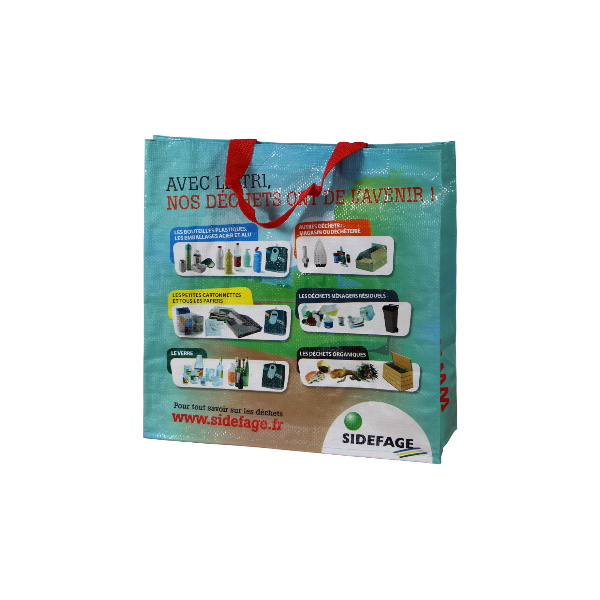 Sac cabas réutilisable et recyclable en polypropylène (PP) tissé. Ce modèle de sac en matière synthétique est à la fois très résistant et facile à nettoyer. Ce type de sac cabas est réutilisables des centaines de fois, ce qui en fait un sac particulièrement respectueux de l'environnement. Il a une durée de vie de plusieurs années.
