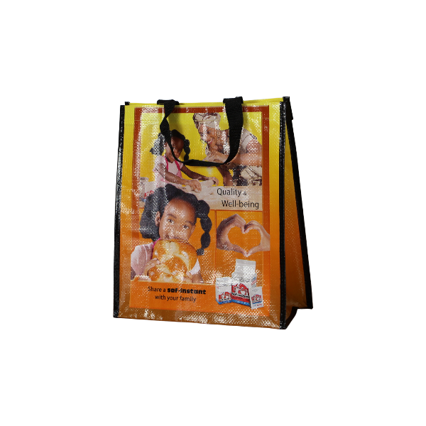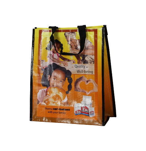 Sac cabas publicitaire réutilisable et recyclable en polypropylène tissé. Ce type de sac en matière synthétique est à la fois résistant et facile à nettoyer. Sac cabas destiné à tout type d'enseigne. Toutes dimensions possibles. Délai de fabrication: à partir de 3 semaines. Quantité min.: 500 ex. (250 ex pour 1 ou 2 couleurs).