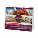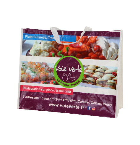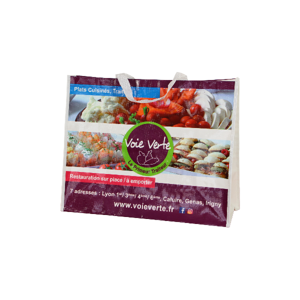 Sac cabas publicitaire réutilisable et recyclable en polypropylène tissé. Ce type de sac en matière synthétique est à la fois résistant et facile à nettoyer. Sac cabas destiné à tout type d'enseigne. Toutes dimensions possibles. Délai de fabrication: à partir de 3 semaines. Quantité min.: 500 ex. (250 ex pour 1 ou 2 couleurs).