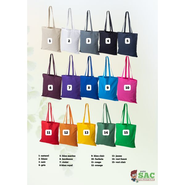 Ce sac publicitaire est disponible en stock en 15 couleurs à partir de 100 exemplaires : écru naturel, blanc, bleu marine, bleu royal, bleu clair, bordeaux, gris, jaune, magenta, noir, orange, rouge, vert clair, vert foncé et violet. Nous pouvons également réaliser des tote bags en coton dans la couleur de votre choix à partir de 2 000 exemplaires.