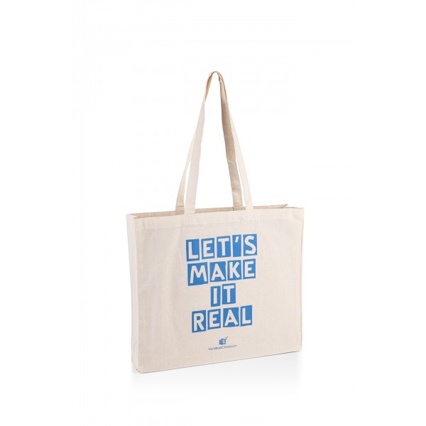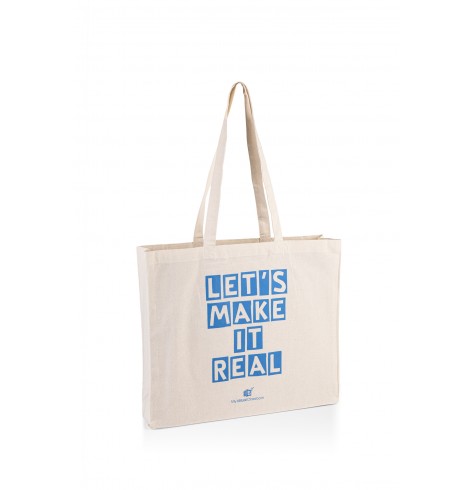 Sac cabas personnalisable en coton naturel 220 gr/m2 certifié Oeko-Tex Standard 100 format paysage. Aspect écologique et résistant. Quantité min.: 100 ex. Délai de fabrication et de livraison: à partir de 2 semaines.